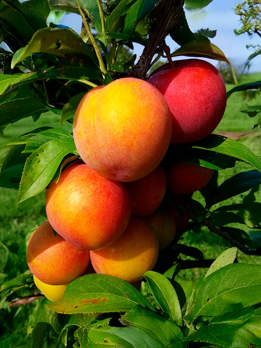 ‘Bella Gold’ — яркий межвидовой гибрид абрикоса, сливы и персика, который объединил лучшие качества трёх культур. Плоды действительно впечатляют: крупные, массой 80–120 г, ровные, золотистые, с красивым солнечным румянцем. Внешний вид очень товарный — сорт сразу привлекает внимание на участке и на столе.