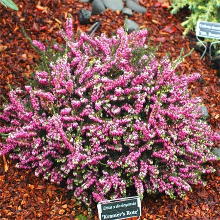 Вечнозеленый стелющийся кустарничек, высотой и диаметром до 40 см. Крона распростёртая, шаровидная. На крепких тонких стебельках располагаются многочисленные продолговатые игольчатые листья темно-зеленого цвета 4 -6 мм длиной. Годичный прирост 8-10 см. Цветки многочисленные, колокольчатые, темно-розовые или рубиново - красные, собранными в соцветия длиной 6-8 мм. Цветет в апреле - мае Латинское название: Erica darl. Kramers Rote Особенности выращивания: Хорошо растёт на солнце, но также и в полутени. В тени и полутени цветки бледнеют, а количество их заметно уменьшается. Местоположение должно быть защищено от ветра. Предпочитает нейтральные или слабокислые, маломощные почвы. Рекомендуется укрытие Применение: Это красивое растение прекрасно сочетается с другими садовыми растениями. Как правило, их высаживают на переднем плане. Эрика хороша в групповых посадках, в каменистых садах – альпинариях и рокариях или на каменистых горках, в виде небольших вкраплений, в качестве почвопокровного растения.