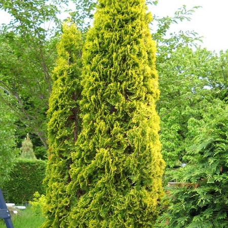 Очень популярная высокая жёлтая форма туи западной колоновидной. Вечнозеленое дерево конусовидной формы с плотной кроной, имеет яркую, сочную золотисто-желтую расцветку, достигает 7-8м высоты, а в диаметре может достигать 1-1,2 м. В возрасте 10 лет растение достигает примерно 2,5м в высоты. Шишки редкие продолговато-яйцевидной формы, коричневого цвета, длиной около 1 см.