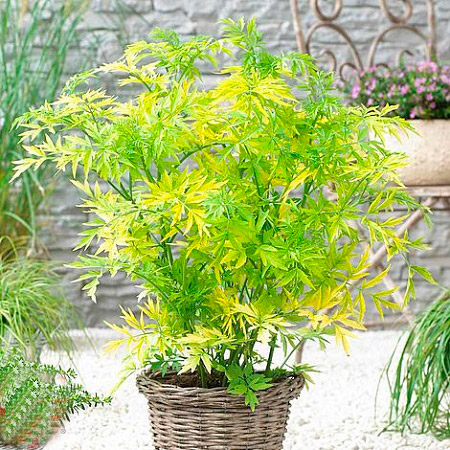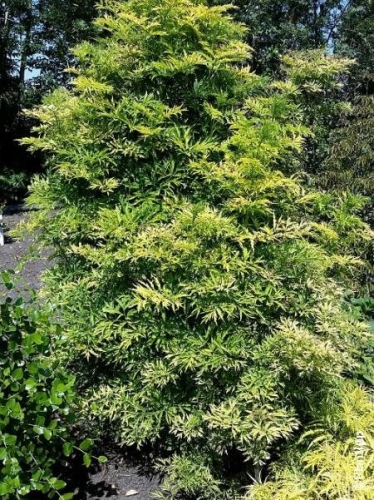 Декоративный кустарник со стройной формой куста и вертикальным ростом побегов. Высота до 3 м. Листья глубоко-разрезанные, золотисто-желтые. Цветки белые, в красивых соцветиях. Плоды сине-черного цвета, сочные.  Цветения продолжительное 25-35 дней, время цветения: конец июня-начало июля.